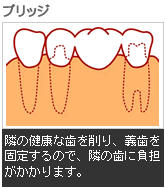 従来は歯を失った場合にはブリッジといって、なくなった歯の両隣の歯を削ってない部分の歯をつくったり、取り外しの義歯(入れ歯)を作っていました。ところが、ブリッジについては失った歯を作る為に両隣の歯を削ることにより、削った歯の寿命が短くなったりすることがあります。また、取り外しの入れ歯は、堅い物を咬むと痛みがあったり、咬む度に入れ歯が動いたりして、必ずしも快適な使用感が得られる訳ではありません。
